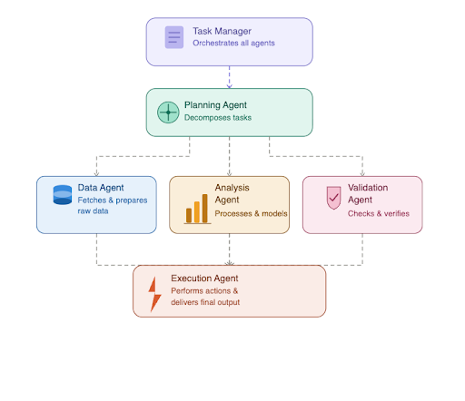 Instead of relying on one agent to perform every task, the system includes several specialized agents, each responsible for a specific capability.