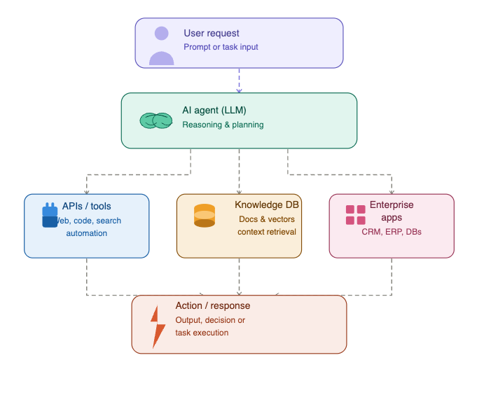 In this architecture, the LLM acts as the reasoning engine, while tools and APIs provide access to enterprise data and functionality.