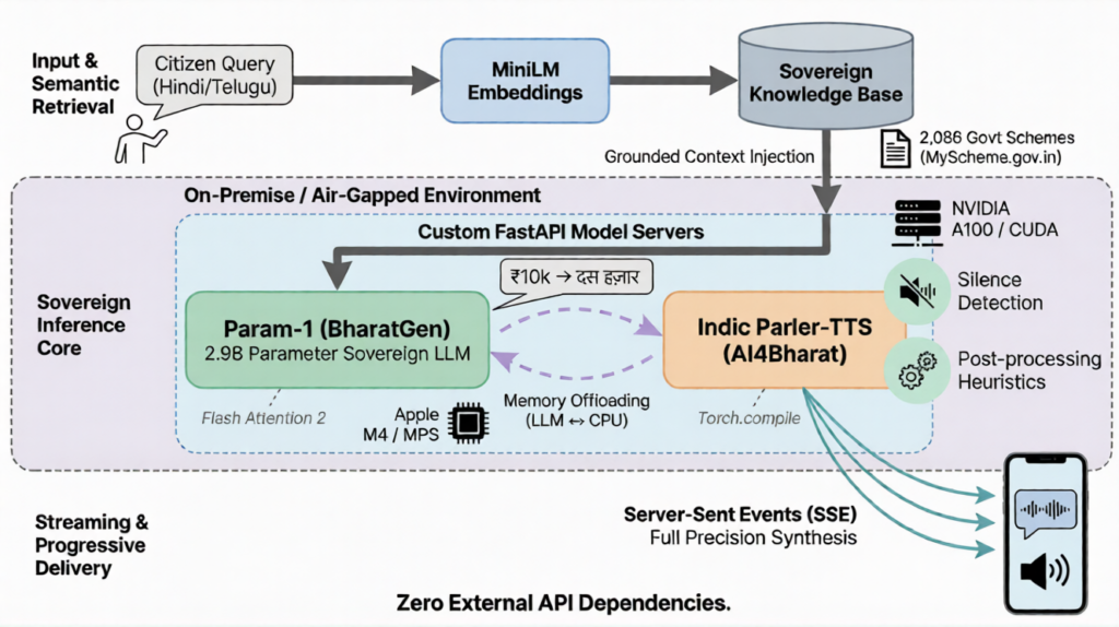 A working Hindi/Telugu voice assistant that answers questions about 2,000+ government welfare schemes. Every model is open-source. Every inference runs on our infrastructure. No data leaves the network.